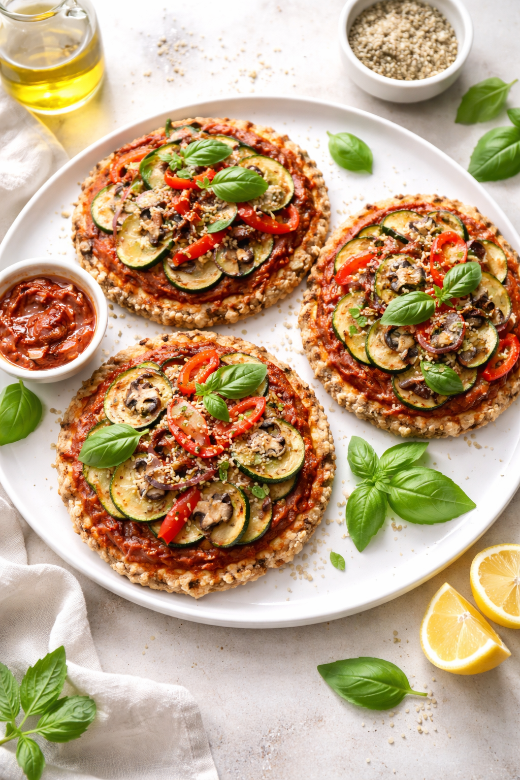 🍕 Raw Pizza with Dehydrated Cauliflower Crust Sun-Dried Tomato Sauce • Marinated…